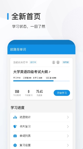 软件内以图表的形式记录了你每天背单词的情况:打卡日历、日期统计、学习进度、单词学习统计,四种图表,实时更新,助你轻松浏览学习数据、清晰把握背单词进度,学习进步看得见。
