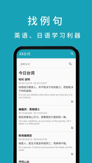 33台词是一款非常好用的台词影片查找神器,如果你想要更快的进行影片名字查找?或者是只记得影片的台词?那就试一试33台词吧。这里可以帮助进行相关台词查找外,也可根据台词查找出行影片,帮助解决你的影片查找问题,也可更好的进行一些素材查找。
