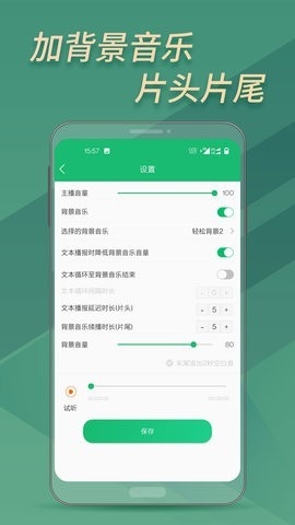 支持背景音乐合成,片头片尾自定义延时,调节背景音量等。