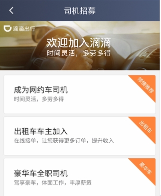 2、在打开的新页面中,选择一种司机类型,平台目前提供了三种司机类型,有网约车司机、出租车车主、豪华车全职司机。这里以第一种网约车司机为例