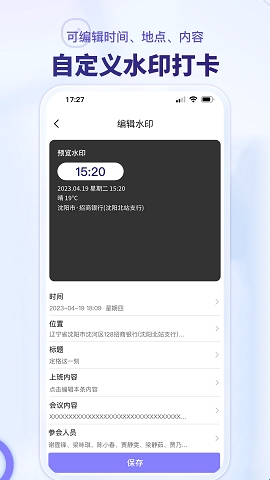 2.拍照自动加打卡水印,时间地点不可篡改;