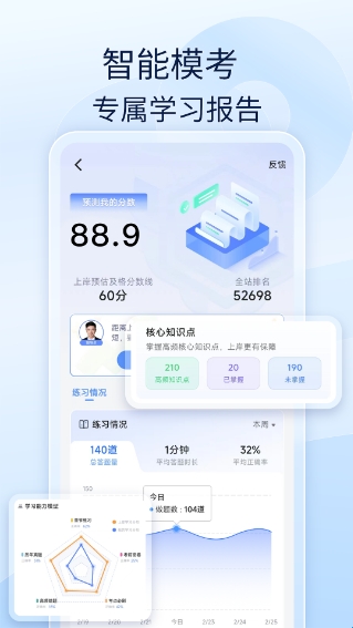 对考生的每个章节、每个科目的考试成绩进行详细统计,帮助考生找到考试薄弱环节。