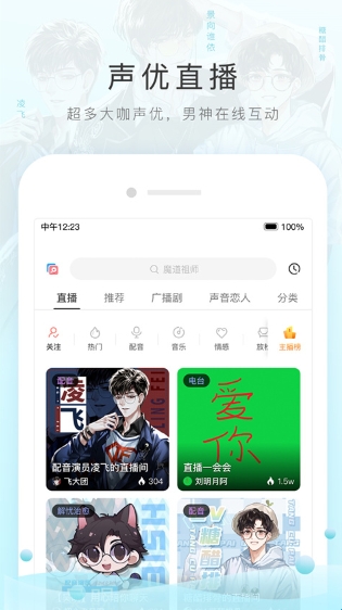 汇集中日知名CV、二次元、段子手、催眠等不同领域的大咖主播;开启语音连麦,和大咖互动,用声音交友;做主播,被搭讪被打赏,从此生活奔小康!