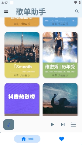 歌单助手是一款为音乐爱好者打造的应用程序。该软件提供了丰富多样的音乐资源和功能,用户可以通过云端音乐库创建个性化的歌单,分享和收藏自己喜欢的音乐作品,以及发现新的音乐风格和歌曲推荐。感兴趣的朋友们快快下载吧。