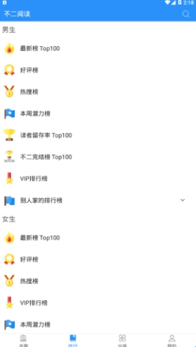 3、男频和女频板块:分别针对男性和女性用户设置了男频和女频两个板块。男频板块主要涵盖男性喜欢的网络小说、历史传记等,而女频板块则以女性喜欢的小说、情感故事等为主,以满足不同性别用户的阅读需求。