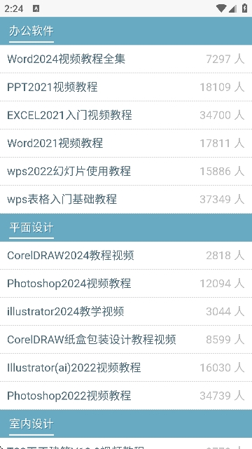 1、下载并打开软件,此时来到主界面,如果暂时不知道想要学习的软件方向,那么最上方可以选择想要学习的软件的领域。