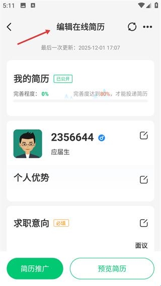 3、编辑在线简历页可完善个人信息等内容,标注必填项,完善度达80才可投递,支持简历推广、预览操作。