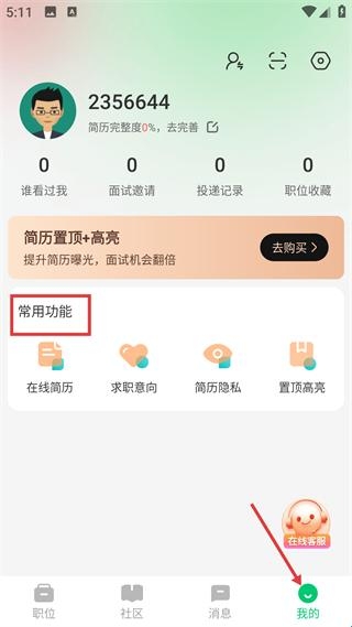 2、个人中心展示账号信息与简历完整度,有求职数据入口,常用功能区含在线简历、求职意向等核心操作入口。