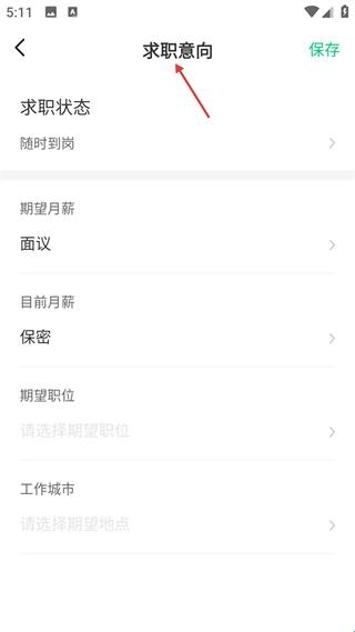 4、求职意向设置页可配置求职状态、期望薪资等信息,每项均可选择输入,设置后点击保存,助力匹配岗位需求。