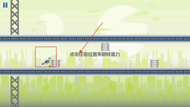 2、进入游戏场景,根据提示“点击任意位置来翻转重力”,操控角色,适时点击,利用重力翻转机制前进。