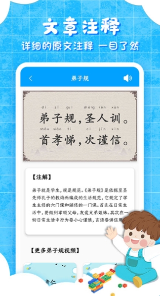 一款专门为中国宝宝设计打造的早教神器——弟子规全文朗读儿童版,软件集弟子规、千字文、三字经、唐诗三百首等多元文化内容于一身,通过朗读、演示和动画等形式进行教学,帮助孩子学习中华传统文化,学习古人们良好的品质,从小养成正确的价值观。