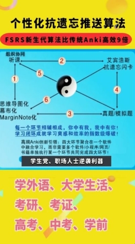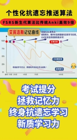 一种新的基于区间重复的反遗忘算法软件——Anki资源库,该软件的功能非常的强大,将传统的学习变得更加科学合理化。同时该软件不仅将艾宾浩斯的遗忘曲线理论提升到了一个新的高度,增加了 FARS的参数;还可以根据自己的记忆效果调整方案,从而更好的强化自己的记忆力。