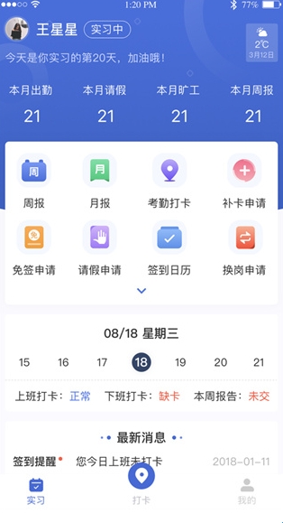 3、平台拥有实习、打卡、请假,周报月报等等丰富功能,可以帮助更好的实习管理。