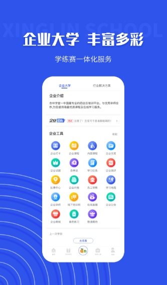 2、进入企业大学,查看各种企业课程内容,在线对企业进行测评,学习更多企业经营知识。