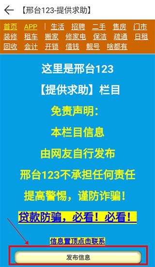 1、邢台123的首页就是很多服务分类,如果想要发布信息,点击对应的分类即可,小编这里以“提供/求助”问题为例,点击进入。