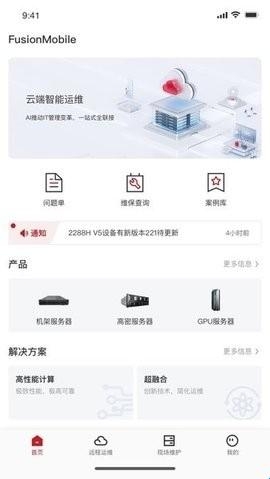 fusionmobile运维app,一款为用户提供数据中心服务器设备的运维服务软件,该软件的功能非常的强大,不仅能够在手机上查看实时的设备运维情况,还可以添加多个产品进行监测,让用户可以及时查看最新的问题单。此外还可以在线查看到设备的3D图,让用户拥有更好的办公体验。