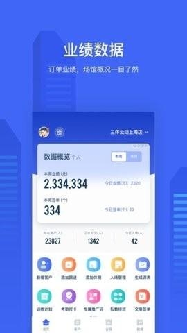 3、进入首页可以查本月的业绩和订单数量,查看潜在的客户,正式的会员,今日入场等