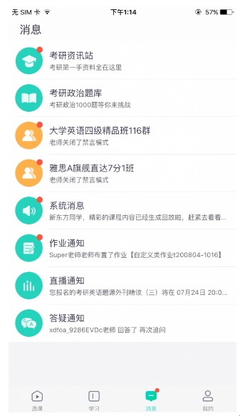 6、消息自动推送,最新的考试资讯、题库更新、直播通知、系统消息、作业通知、答疑通知等都能及时知道。