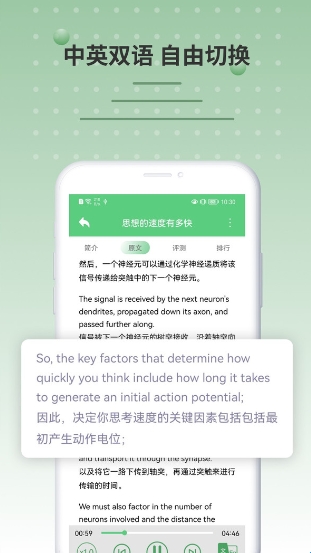 1、内容针对不同英语水平的学习者提供全英文和中英文对照两种形式,并能够随意切换。