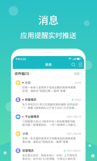 1、学校基于平台可以实现家校互动,通过微门户、班级圈发布学校资讯、展示班级风采。