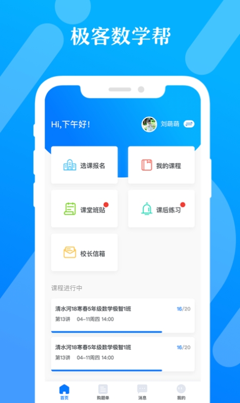 4、在线报名:想要续报极客数学帮课程,却因为工作繁忙无法抽身前往校区报名,极客数学帮APP强大的在线功能,让家长无需出门一步,便能一键搞定课程查询、报名选座及线上缴费,随时随地为孩子选择更适合的老师与班级。