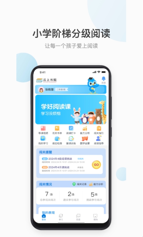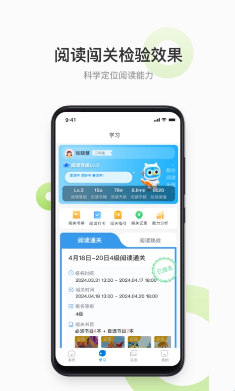 孩子阅读书籍后,可在手机端或者电脑端进行答题闯关,检验阅读的效果。老师和家长可根据阅读测评数据了解孩子的阅读情况,对孩子进行针对性的阅读指导,从而有效提升孩子的阅读能力。