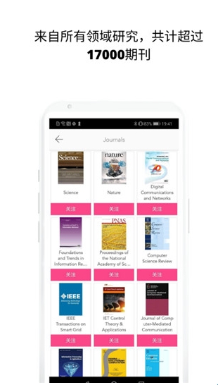2、选择各种分类查找或者直接搜索期刊的名字,找到选择关注,就可以在首页中浏览了。