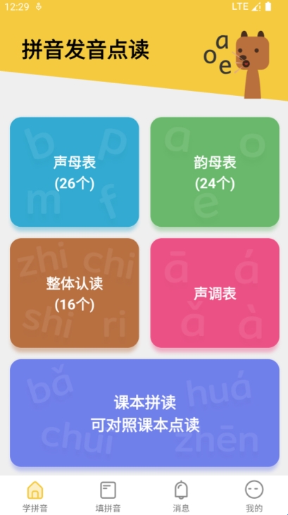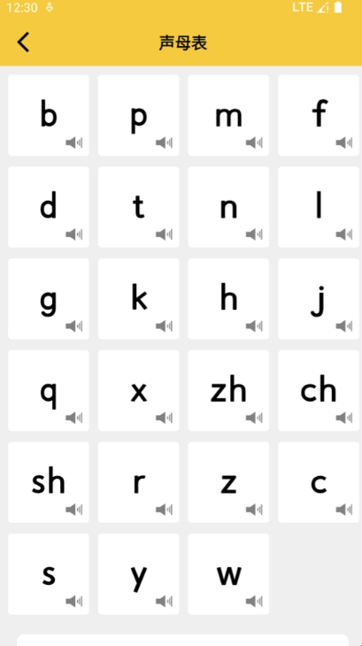 拼音发音点读app免费版是一款专门为学前儿童和一年级学生或正在学习汉语的人士设计打造的拼音学习软件。软件提供有声母表,韵母表,整体认读表,涵盖47个声母、韵母,包括单韵母、复韵母、前后鼻音、整体认读音节,能够帮助用户更好的学习拼音。