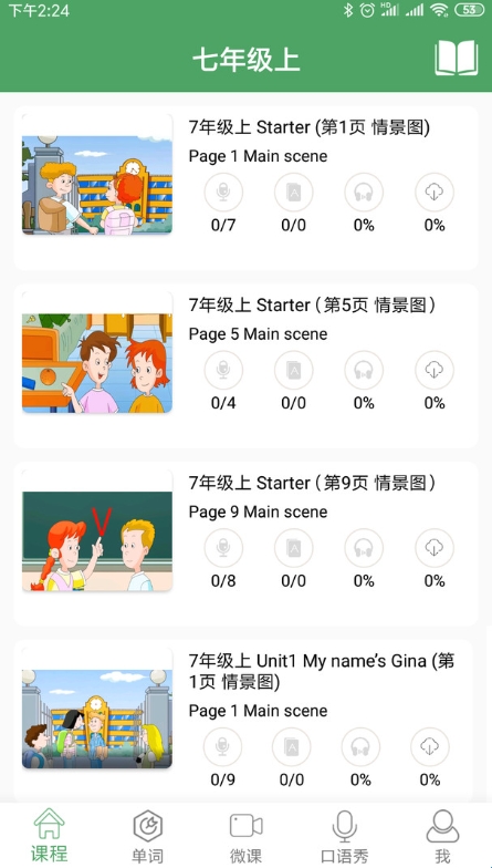 1、课本同步包含初中单词和课文点读、同步练习、讲解。