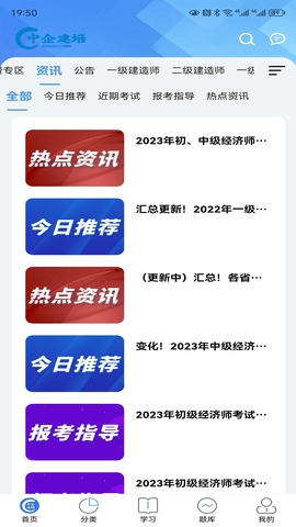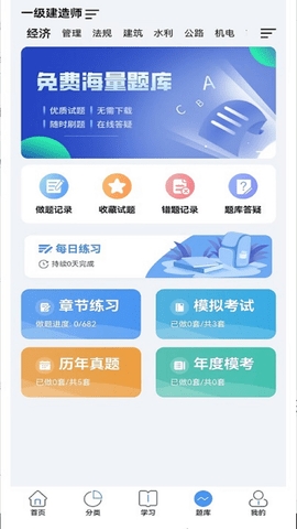 1、下载安装好并打开中企建培app,点击【学习】或者【题库】或者【我的】。