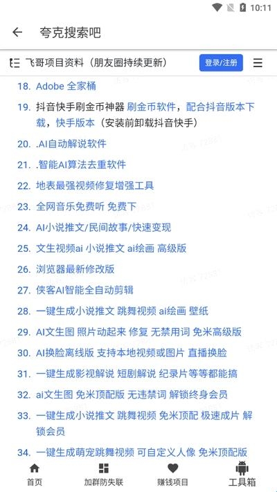 夸克盘搜App是一款功能强大的搜索工具,用户只需输入关键词,就能快速找到所需的影视、教育、办公等资源,还有工具箱应用,里面包含多种实用工具,帮助用户一键解决各种问题,所有资源功能免费使用,快来下载体验吧。