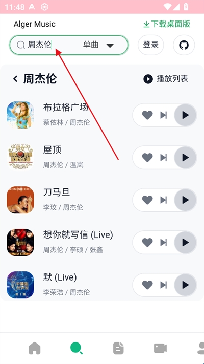 在搜索框输入歌手或者歌名关键字可以快速查找到