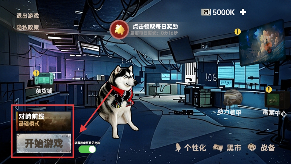 1、主界面中找到【对峙前线-基础模式】的【开始游戏】按钮就能进入战斗,记得先点击领取【每日奖励】,还能去【杂货铺】补充物资。