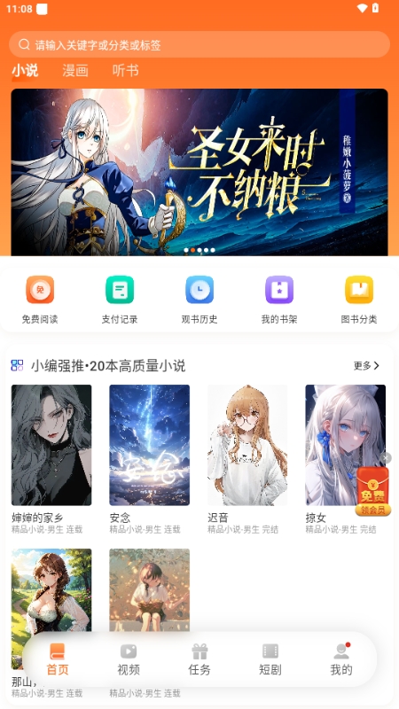2、小说、听书、漫画资源非常多,基本上覆盖了所有,总有你需要的,而且没有广免费用,真正做到了能看能听
