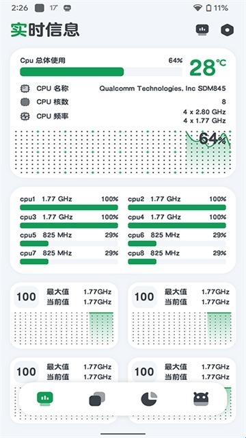 cpu监测也叫Cpu Monitor,拥有非常强大且专业的CPU负载信息监测功能,不仅可以为你提供涵盖CPU温度,CPU使用频率、使用率等各类详细的信息,还可以根据软件已经收集到的相关数据来对历史资源进行详细的分析,轻松观看手机中正在使用的各个应用的资源占用,方便用户及时做出调整。