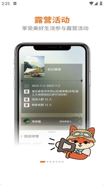 狐小旅app是一款非常好用的露营服务软件,这款软件的功能丰富多样,用户不仅可以在这里看见不同的露营爱好者的露营动态,也可以了解各种露营经验和露营攻略。这款软件支持各种露营信息的查询,为用户提供了一个舒适便捷的露营服务平台。对这款软件感兴趣的朋友们快来下载体验吧。