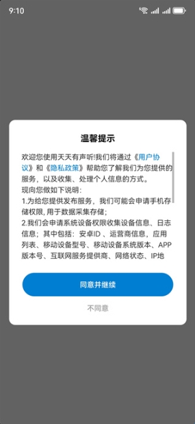 打开app,阅读用户协议和隐私政策之后点击同意并继续;