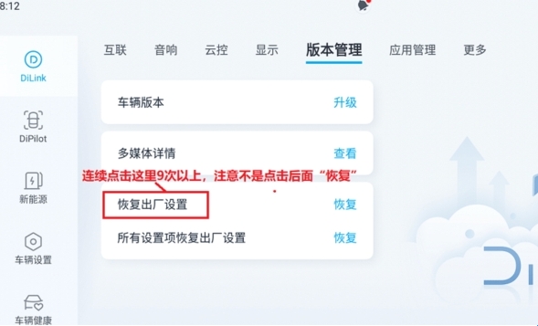 6、根据您的车辆型号和系统版本的不同,可能需要执行特定的操作来开启ADB调试。例如,一些车型可能需要多次点击“恢复出厂设置”,而其他车型可能需要下载特定软件并通过该软件的引导来开启ADB调试。