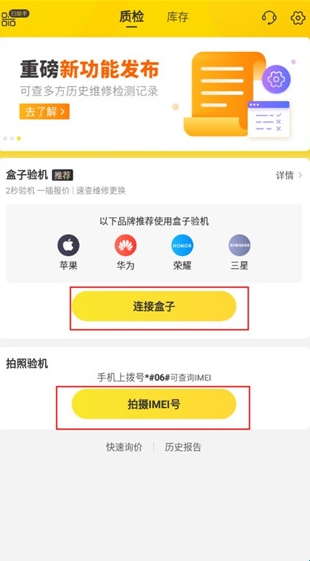 首先我们打开软件,来到首页后可选择两种不同的验机方法,建议使用盒子验机,点击连接盒子