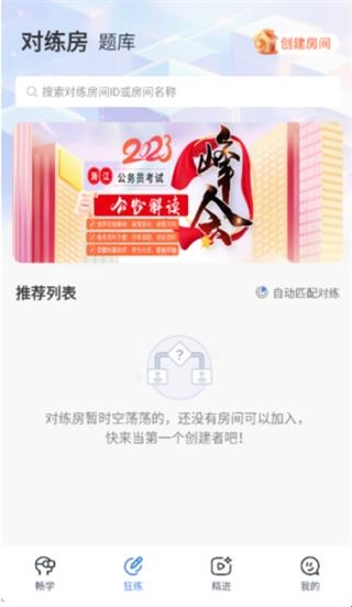2、点击下方工具栏狂练,可以搜索对练房间ID或房间名称信息,还会为用户进行推荐各类信息。