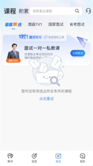 3、点击下方工具栏精进,有面霸优选、面霸一对一、国家面试以及省考面试等版块。