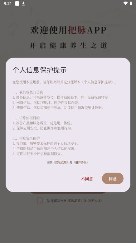 1、首先打开应用阅读完“个人信息保护提示”后点击“同意”按钮进入app中。