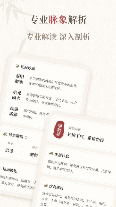 帮助用户专业解读自己的脉象解析,对每一次的脉象测量都可详细解读,深度洞察。