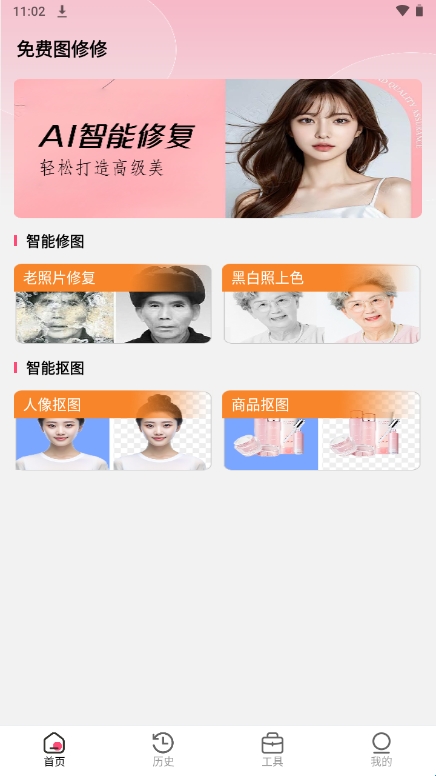 1、安装进入首页,平台带来了智能修图和抠图功能,免费开启。