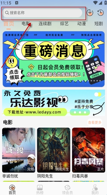 在搜索栏输入影片名称、演员名等关键词,点击搜索按钮,可精准查找目标影视。