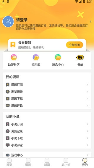 点击最后一个模块“我的”,在此可以进行签到和注册登录,以及加入动漫社区。