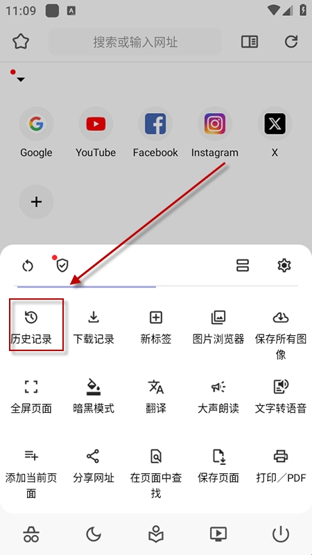 3、通过菜单中的“历史记录”查看浏览痕迹,支持删除或重新访问。