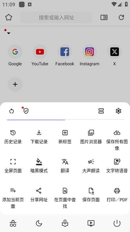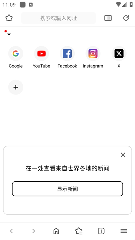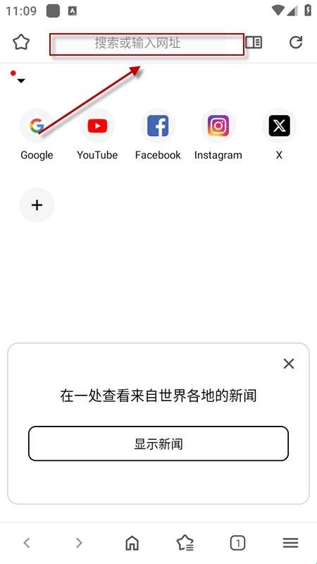 1、下载安装后打开APP,在顶部搜索栏输入网址或关键词,直接访问网站;