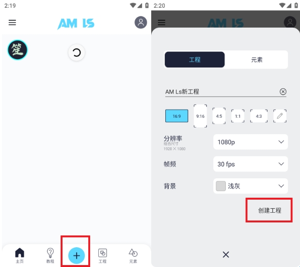 打开alight motion凉笙版最新版软件,新建一个项目,点击右下方位置