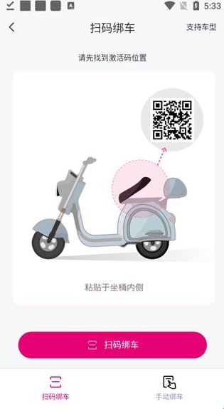 选择扫码绑定注意二维码在坐桶内测,也可以手动输入激活码或车架号绑定。